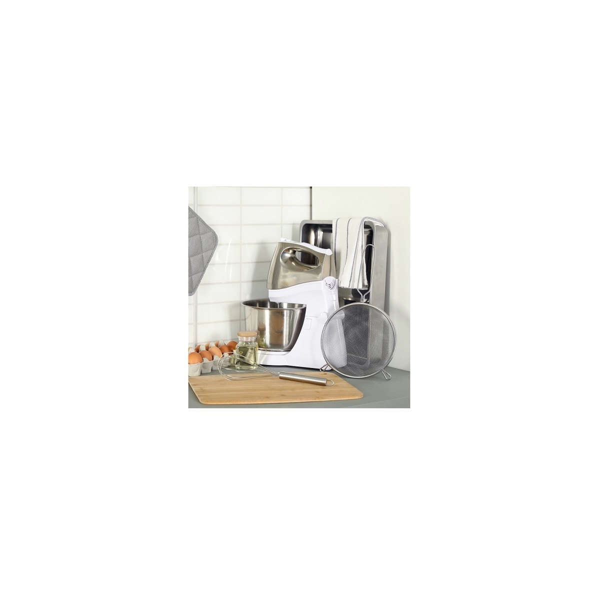 Má průměr 24 cm. Díky přední zarážce jej lze snadno uchytit za okraj hrnce. Zároveň má delší držadlo, které nejenže usnadňuje manipulaci s ním, ale také umožňuje jeho pověšení na zeď.