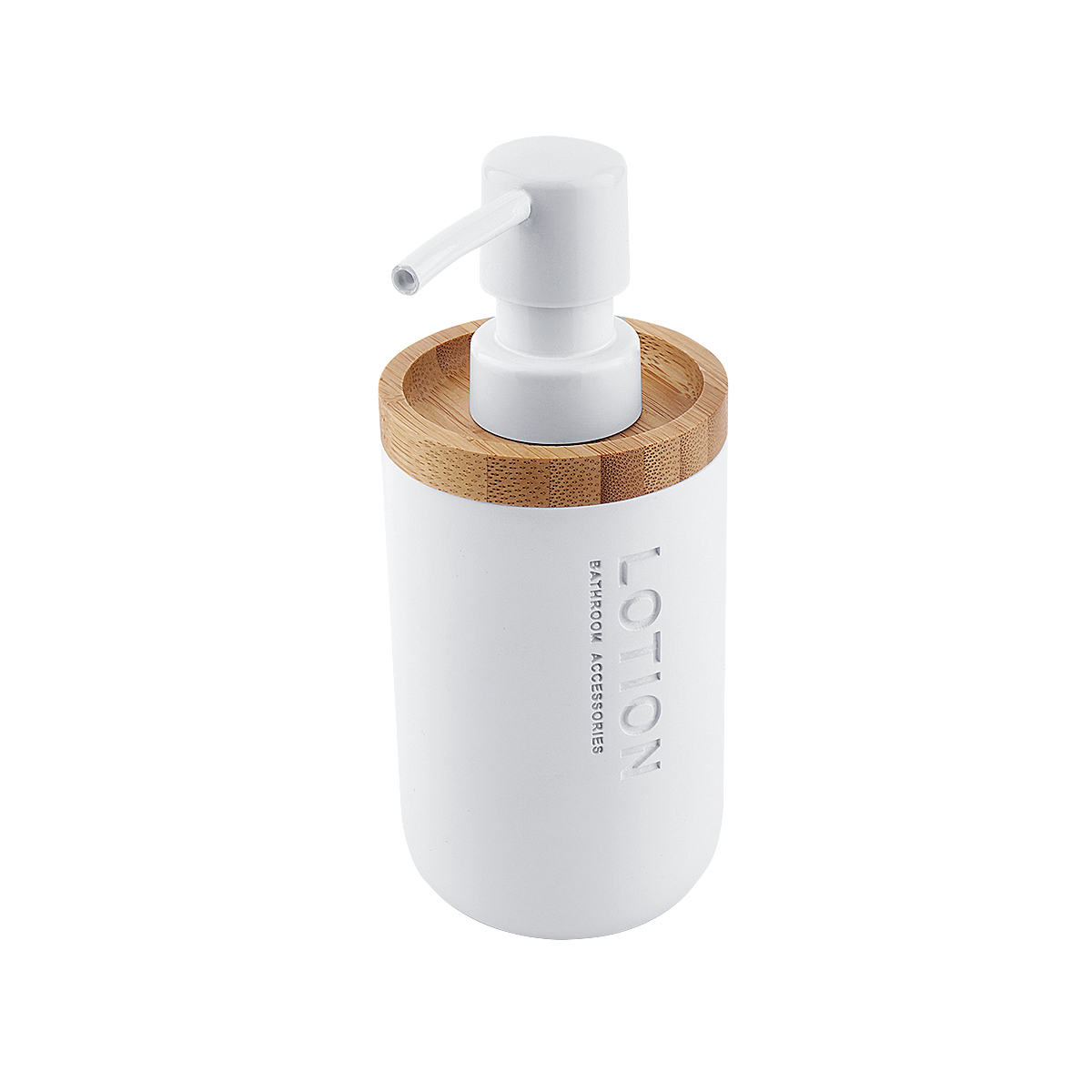 Dávkovač na tekuté mýdlo. Barva bílá. Materiál polyresin, bambusové dřevo. Objem 270 ml.