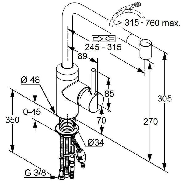 • teleskopický výtok otočný o 220°, vytažitelný až 760 mm