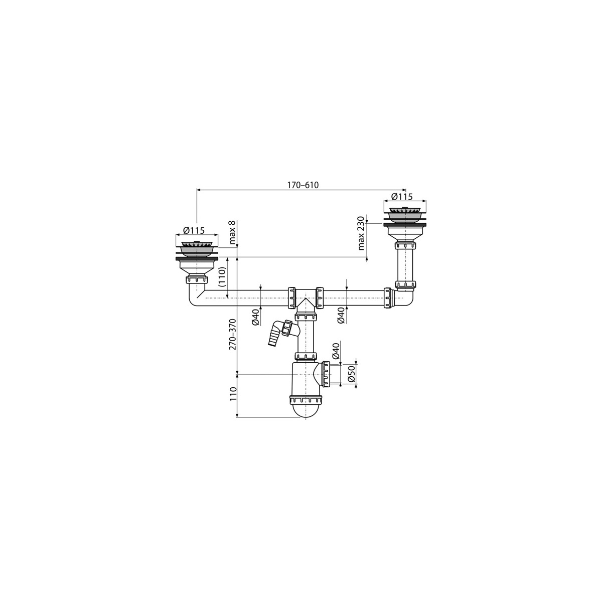 Dřezový sifon A454P s výpustí 115 mm, odpad 40/50 mm, s přípojkou, Alcadrain A454P