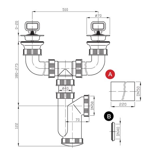 Dřezový sifon s výpustí 70 mm, odpad 40/50 mm, Plast Brno ET00450