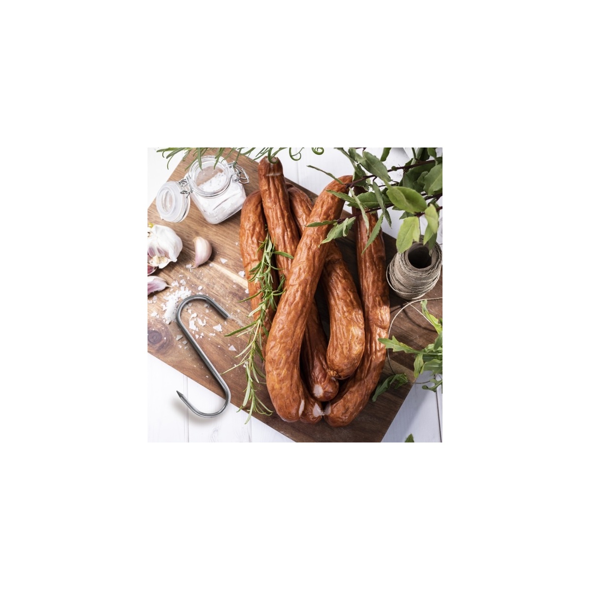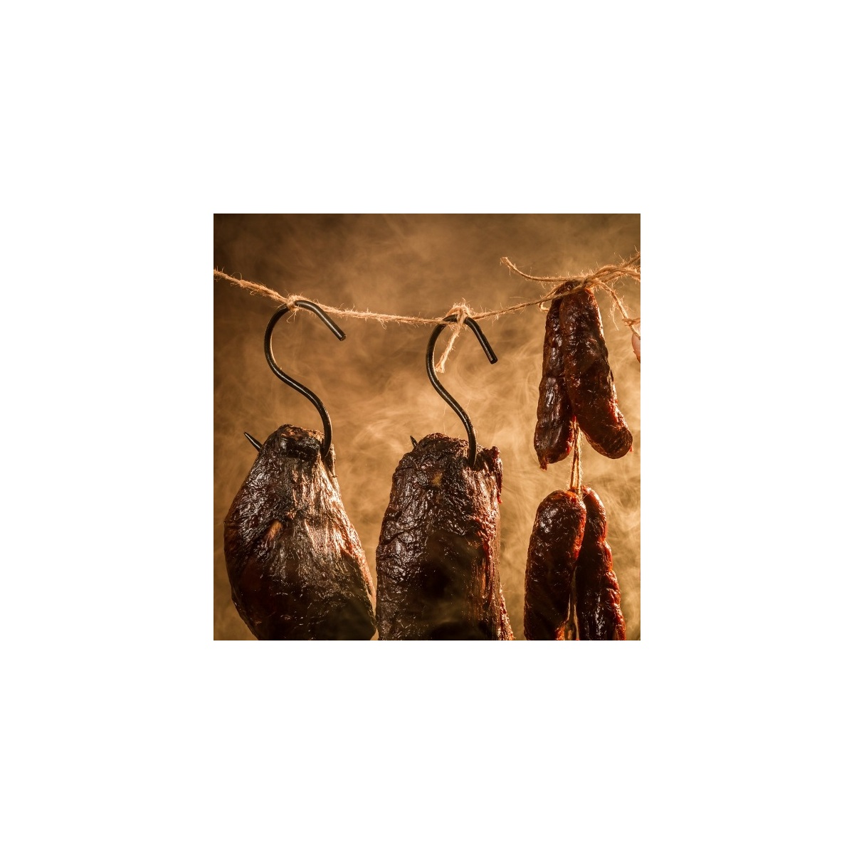 Tento nerezový háček má výšku 13,5 cm a šířku 9 cm. Hodí se například na zavěšení masa do udírny. Na jedné straně má ostrý hrot, který snadno projde i větším kusem masa. Sada obsahuje tři kusy.