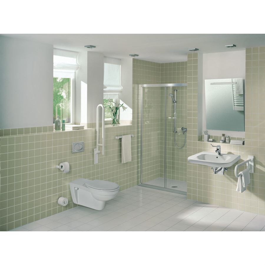Contour 21 závěsný klozet s hlubokým splachováním pro tělesně postižené ze slinutého keramického střepu (VC). EN 997. EN 18040. Glazováno pod kruhem. Pro podomítkovou nádržku se splachovací kapacitou 6 l nebo pro podomítkový tlakový splachovač 3/4“. Instalace: s podomítkovým modulem do zdi nebo do sádrokartonové příčky. Instalace možná pouze s prodlužovací splachovací trubkou (K836167).