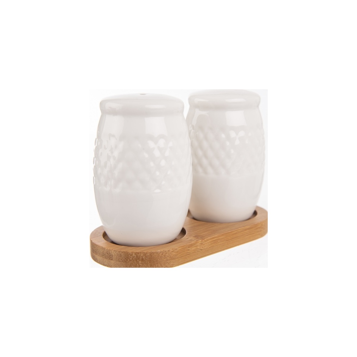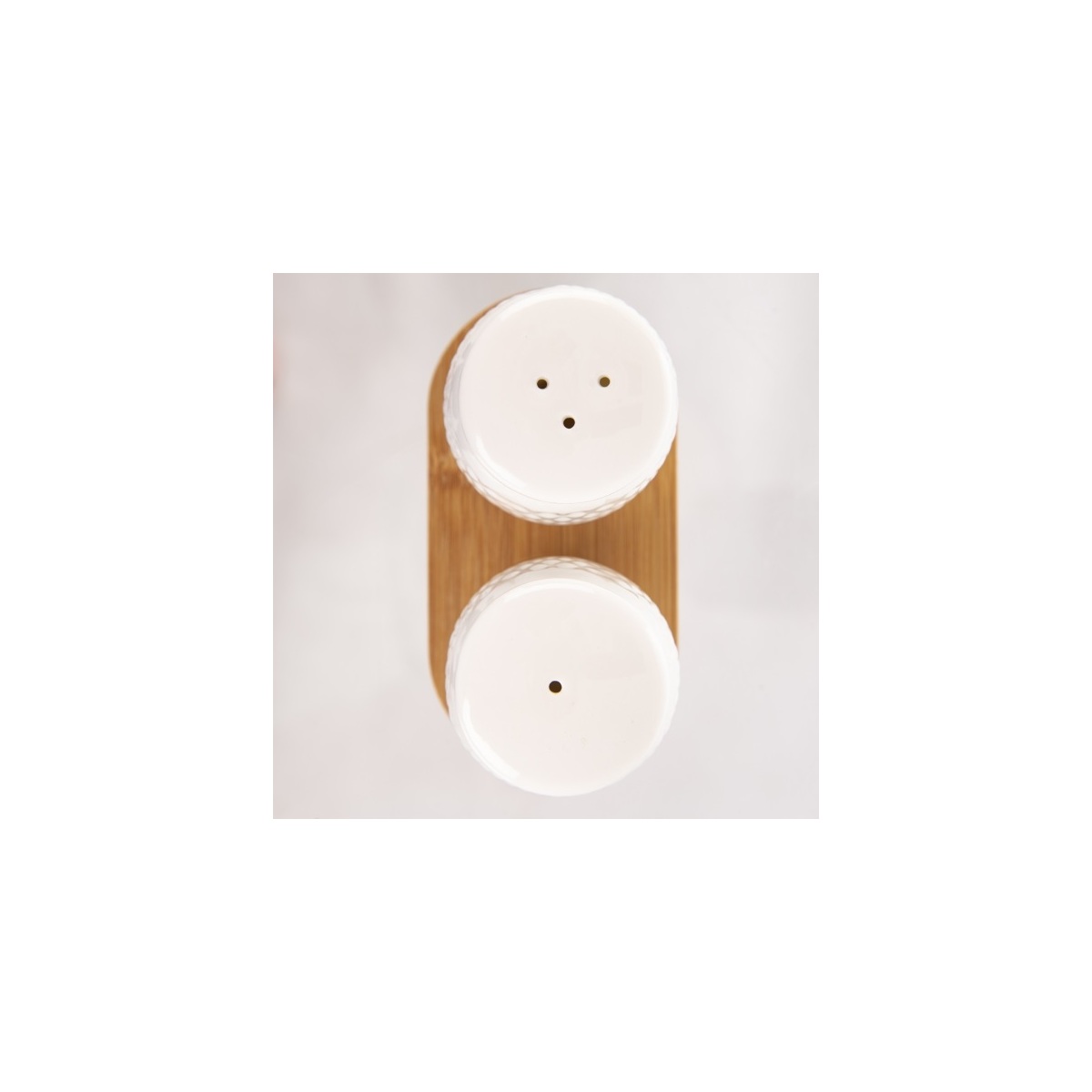 Souprava solničky a pepřenky na stojanu. Materiál: porcelán, bambusové dřevo. Rozměry: kořenka pr. 4,5 cm, v. 7,5 cm, 11,5x6x8,5 cm.