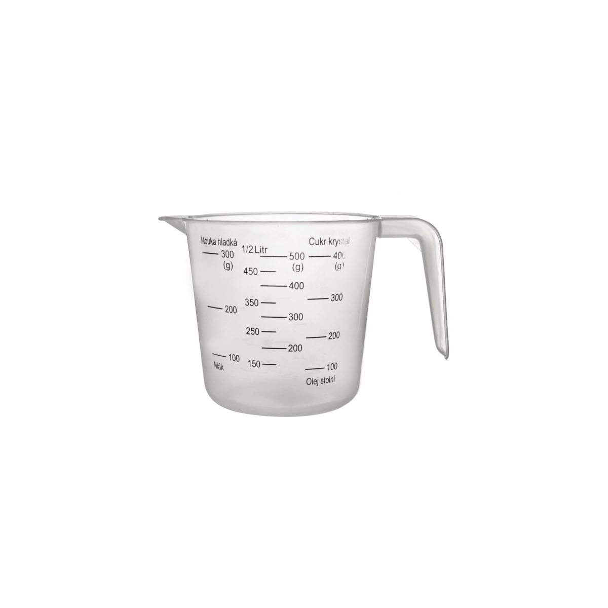 Výhodou je praktická výlevka, která usnadňuje vylévání nebo vysypání jejího obsahu. Plastové ucho ulehčuje manipulaci s nádobou. Má objem 500 ml.