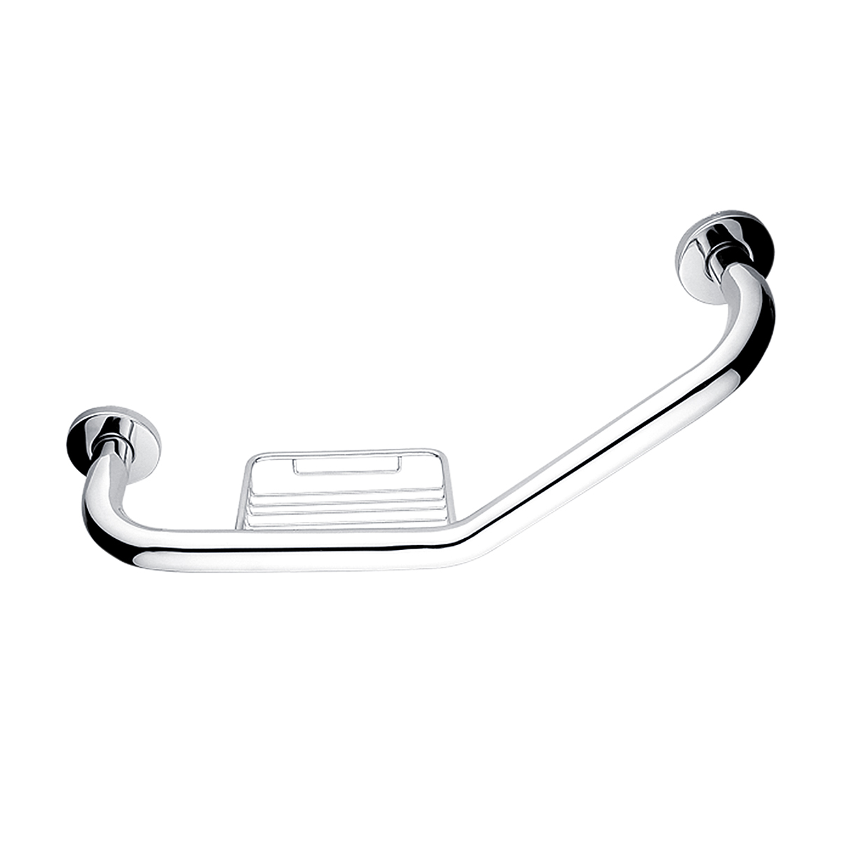 Pomocné přidržovací lomené madlo s mýdelníkem k vaně nebo do sprchového koutu.