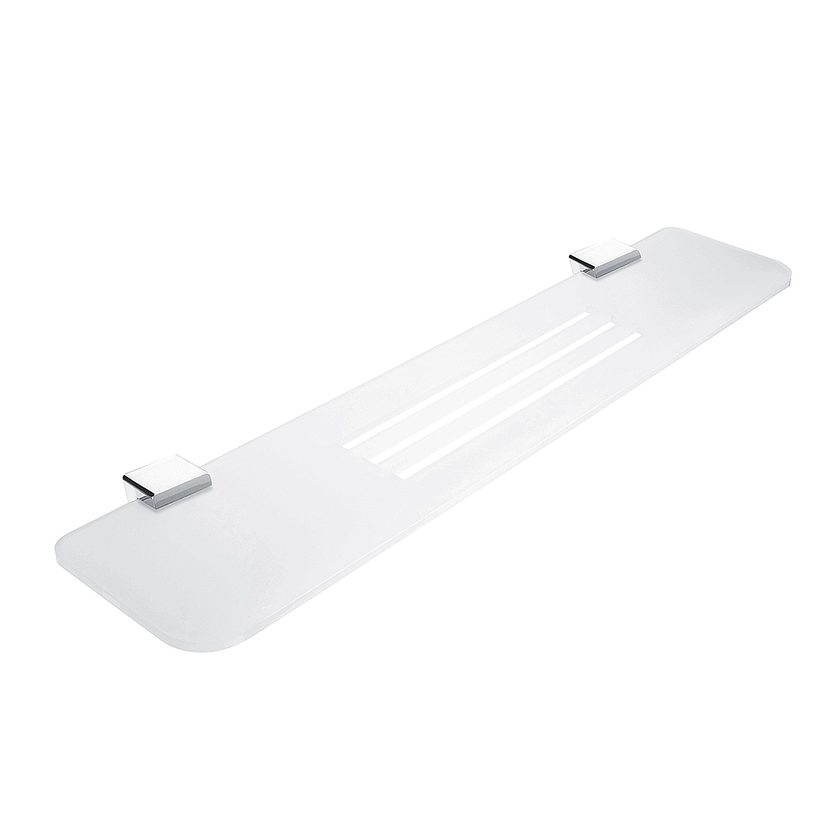 Police s frézovanými otvory. Materiál plexiglass s matovaným povrchem. Délka 60 cm. Úchyty mosaz / chrom.