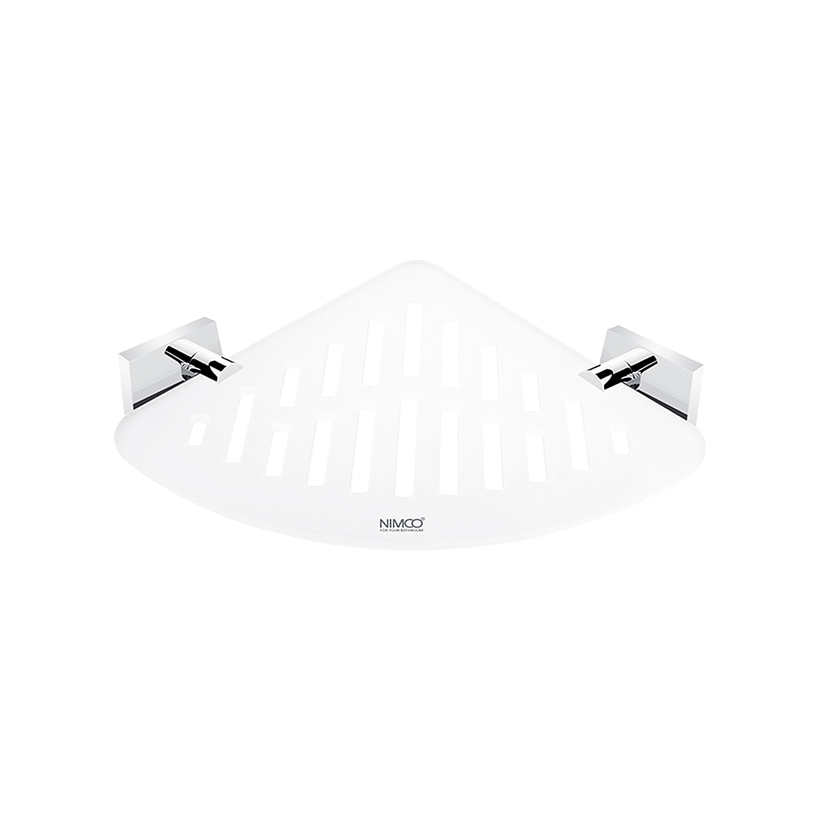 Rohová polička plexiglass s frézováním. Úchyty mosaz / chrom. Rozměr 23,5x23,5 cm.