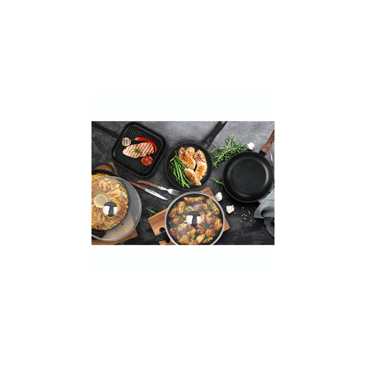 Korpus této odlévané pánve je tvořen slitinou hliníku, která zajistí tvarovou stabilitu pánve, a je potažen kvalitním antiadhezním povrchem PFLUON GRANIT. Rukojeť je izolovaná, příjemně se drží a usnadňuje manipulaci, prohazování jídla. Tuto středně velkou pánev ocení běžné domácnosti, když chcete připravit steaky, filety, masové směsi, restovat zeleninu, připravovat bramboráky, palačinky apod.