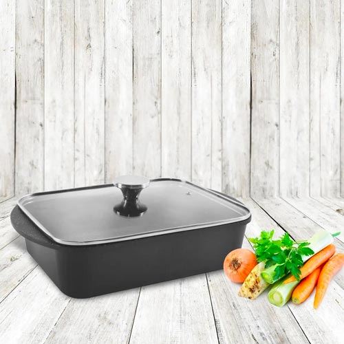 Odlévaný masivní pekáč je opatřen skleněnou poklicí s nerezovým lemem a otvorem pro únik přebytečné páry, budete tak mít přehled nad stavem připravovaného pokrmu.