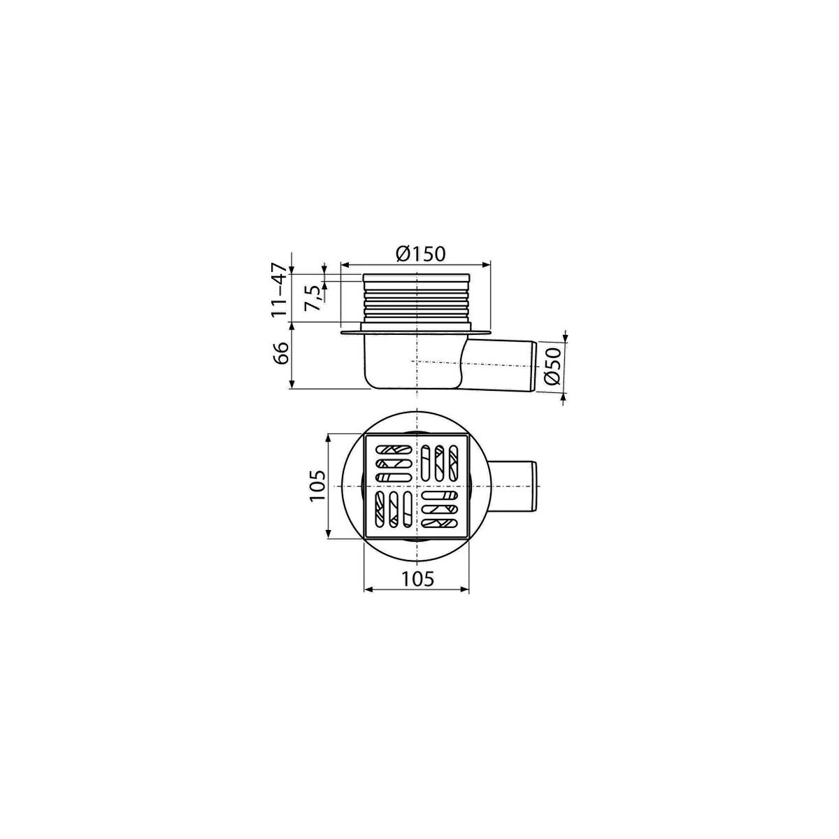 Podlahová vpusť 105 x 105 mm, mřížka nerez, boční odtok d 50 mm, Alcadrain APV26