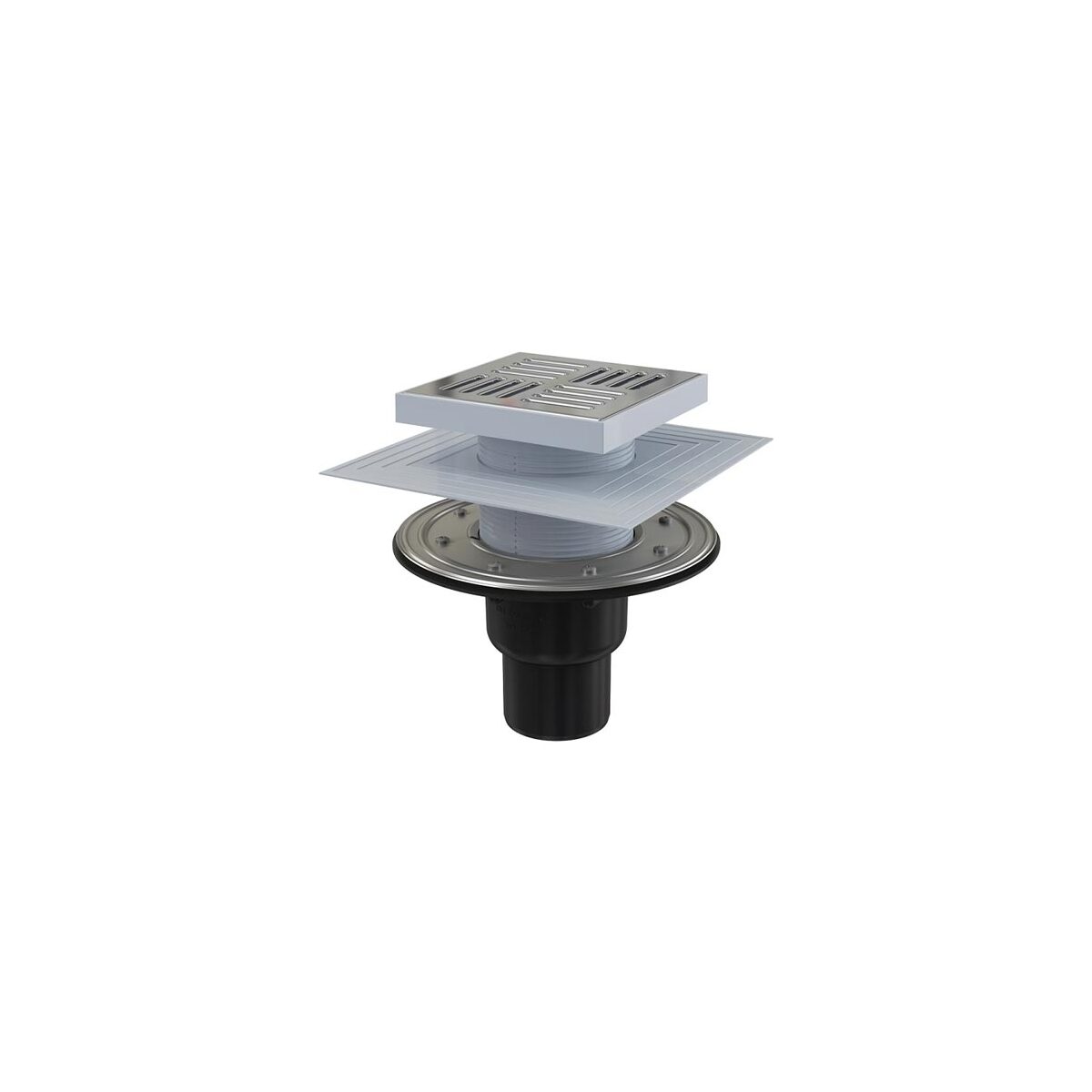 Plastová podlahová vpusť s nerezovou mřížkou, spodním odtokem, vodní a suchou zápachovou uzávěrou