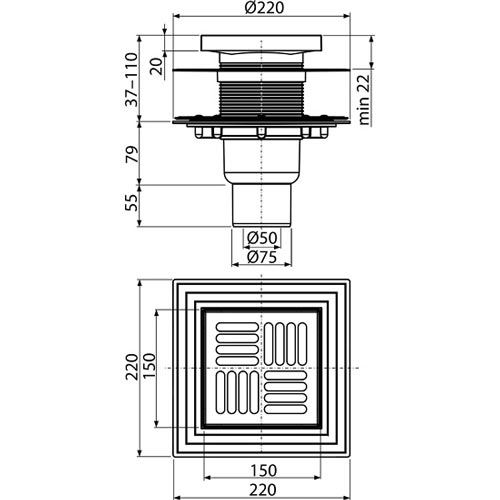 Podlahová vpusť 105 x 105 mm, mřížka nerez, spodní odtok d 50/75 mm, Alcadrain APV4444