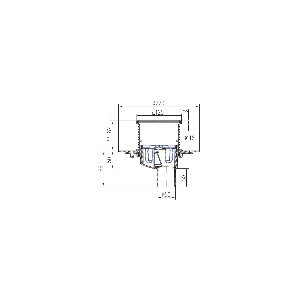 Podlahová vpusť určená pro venkovní i vnitřní použití se připojuje k vertikálnímu odpadnímu potrubí o průměru 50 mm. Vpusť je vyrobena z polypropylenu a nerezové oceli, které odolávají korozi, okolnímu namáhání a rozdílným teplotám vody, která může dosahovat teploty až 90 °C. Velmi dobré zpracování podlahové vpusti zajišťuje snadnou montáž a cenově dostupný výrobek, který si oblíbí úplně každý. Kombinací použítých kvalitních materiálů a precizního zpracování odolá zatížení až 300 kg.