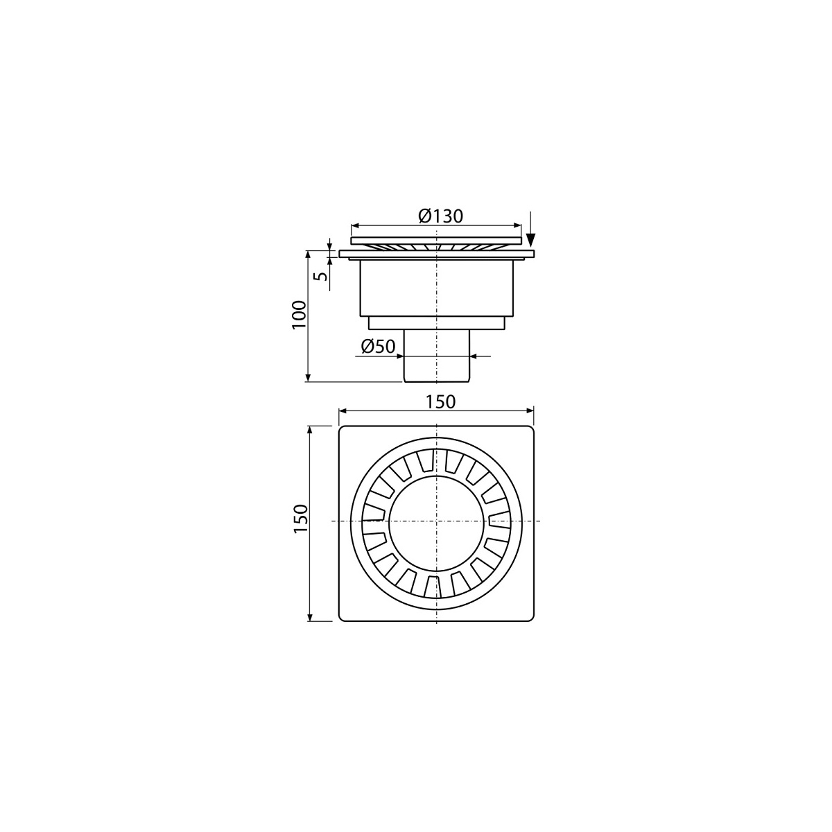 Podlahová vpusť 150 x 150 mm, mřížka šedá, boční odtok d 50 mm, Alcadrain APV16