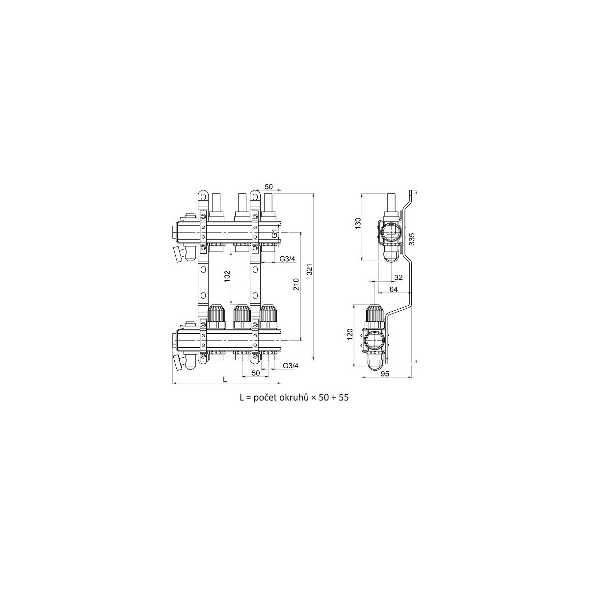 - Výstupy pro svěrné šroubení G 3/4". (Svěrné šroubení není součástí balení rozdělovače.)