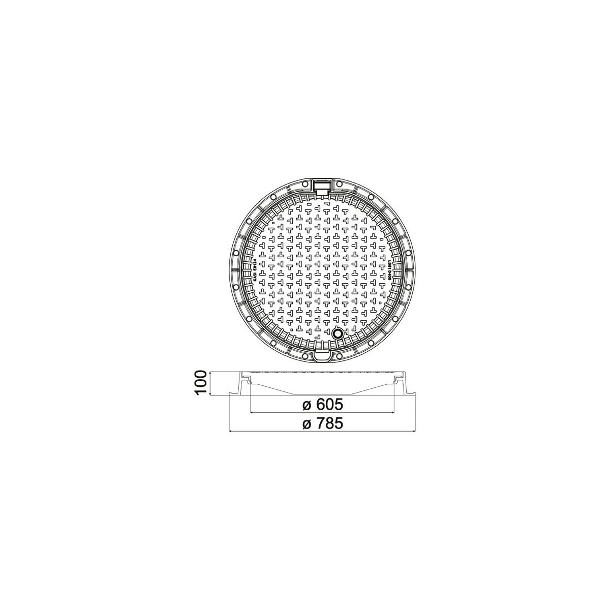 Litinové víko šachtového poklopu je usazeno do rámu vyrobeného z tvárné litiny s patkou. Co nejmenší kontrolní otvory zajišťují co největší spodní plochu rámu, aby se omezila destrukce maltových spojů a betonových prvků. Víko je osazeno tlumící vložkou z EPDM odolnou vůči rozmrazovacím látkám. Poklop je s pantem zajišteným čepem proti vyjmutí z rámu a s pružinovým zajištěním víka v rámu. Díky "T" designu víka je minimálizovaná hlučnost poklopu způsobenou přejezdy automobilů. Litinové víko bez odvětrání s protiskluzovým designem a bezpečnostní aretací v inspekční poloze (při 90°), která brání samovolnému uzavření. Třída zatížení šachtového poklou je D 400 a hodí se pro zabudování v místech s maximálním zatížením 40 tun, přesto rám není vhodný do vysoce zatěžovaných míst.