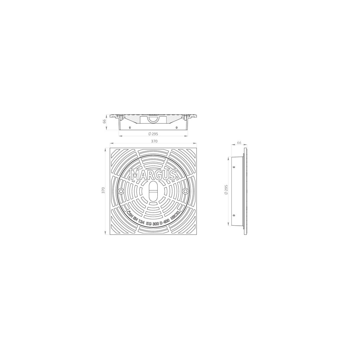 Šachtový poklop MARGUS s čtvercovým rámem je ideální řešení pro zakrytí revizních kanalizačních šachet s průměrem 315 mm. Tento poklop je vybaven čtvercovým rámem a snadno se instaluje nasazením na hladký konec roury. Je navržen tak, aby splňoval požadavky na vysokou nosnost – třída zatížení D400 zajišťuje maximální zatížení 40 tun, což jej činí vhodným pro instalaci vozovkách pozemních komunikací, pro zpevněné krajnice a parkovací plochy přípustné pro všechny druhy silničních vozidel. Vyroben z tvárné litiny GGG, to zaručuje pevnost a dlouhou životnost. Poklop je povrchově upraven bitumenem, který zajišťuje zvýšenou ochranu proti vlivům prostředí. Poklop určený k obetonování je pevně ukotven v zemi, čímž poskytuje stabilní a bezpečné krytí kanalizačních šachet.