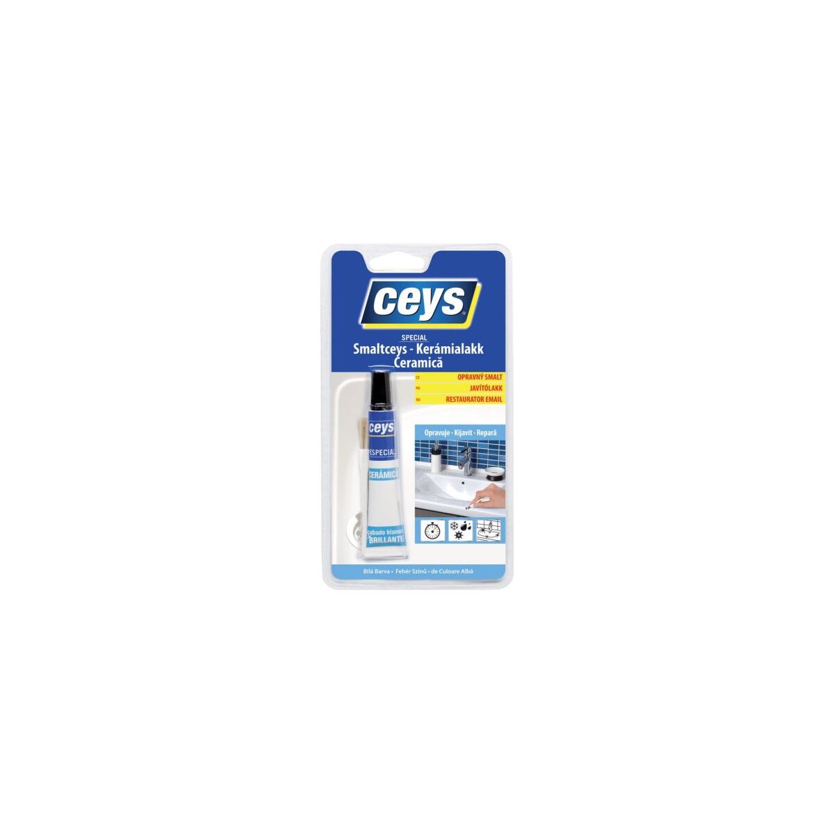 Opravný smalt bílé barvy je snadno použitelný, určený k opravě škrábanců, oprýskání a odlupků na smaltovaných površích a na všech typech keramických výrobků (porcelán, kamenina, kuchyně, koupelny, umyvadla, vany, elektrospotřebiče, nádobí, porcelán…). Odolný vůči teplu, zimě, teplotám až do +100 °C, teplé vodě a čisticím prostředkům.