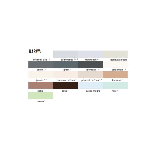 Vytisknuté vzorky barev slouží k orientaci a nejsou závazné. Nelze vyloučit barevné odchylky od zabudovaných spár z důvodů technických možností tisku. Rozdílné podmínky na stavbě mohou ovlivnit optiku spár. Toto nemá vliv na přídržnost. Doporučujeme proto zásadně provedení zkušebního spárování.