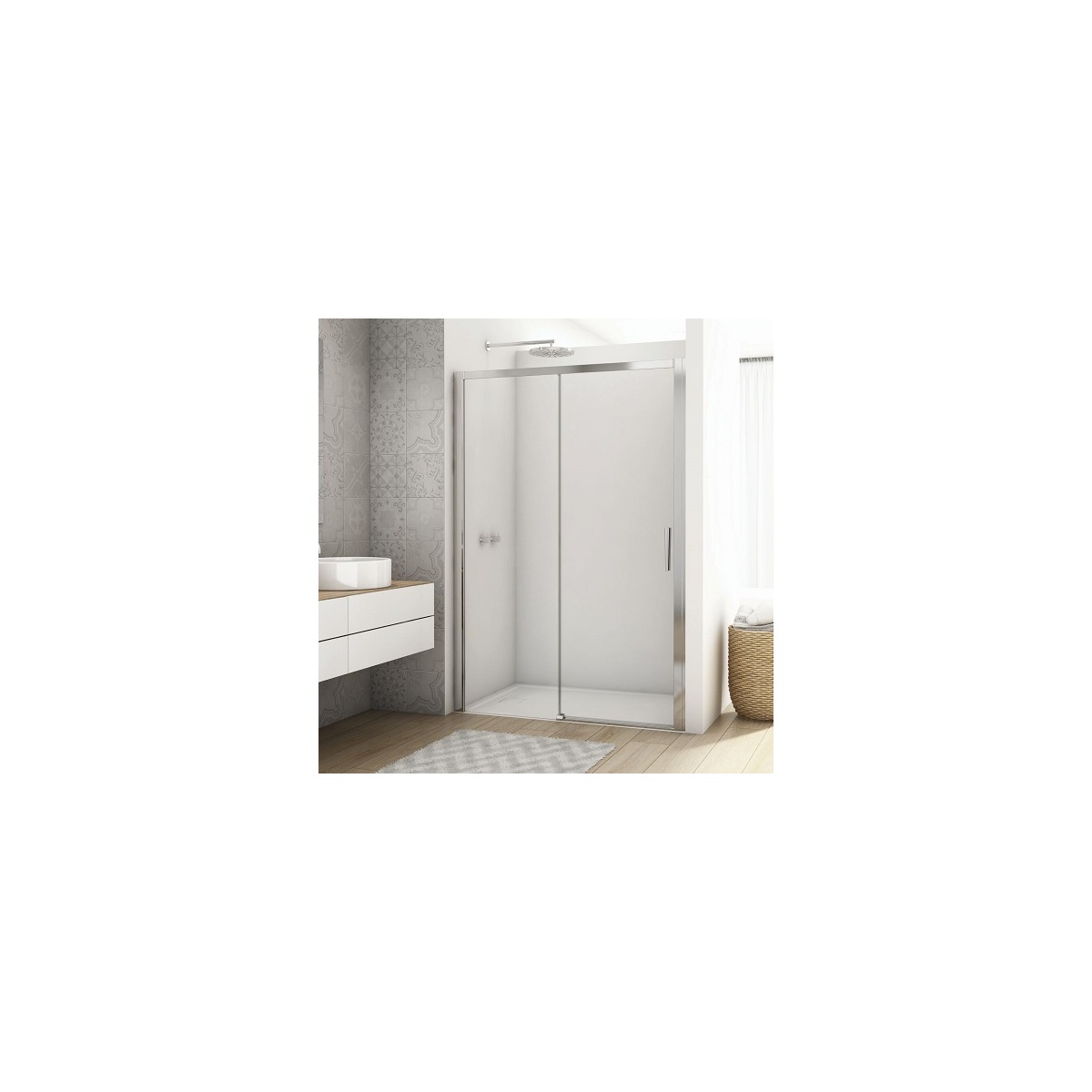 TOPS2 - 140 aluchrom+transparent - jednodílné posuvné dveře s pevnou stěnou v rovině - 6 mm bezpečnostní sklo, magnetické těsnění, chromované plastové dílky a madlo i u bílého a eloxovaného rámu