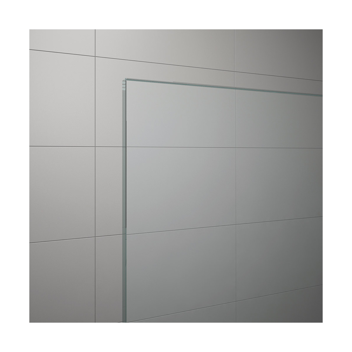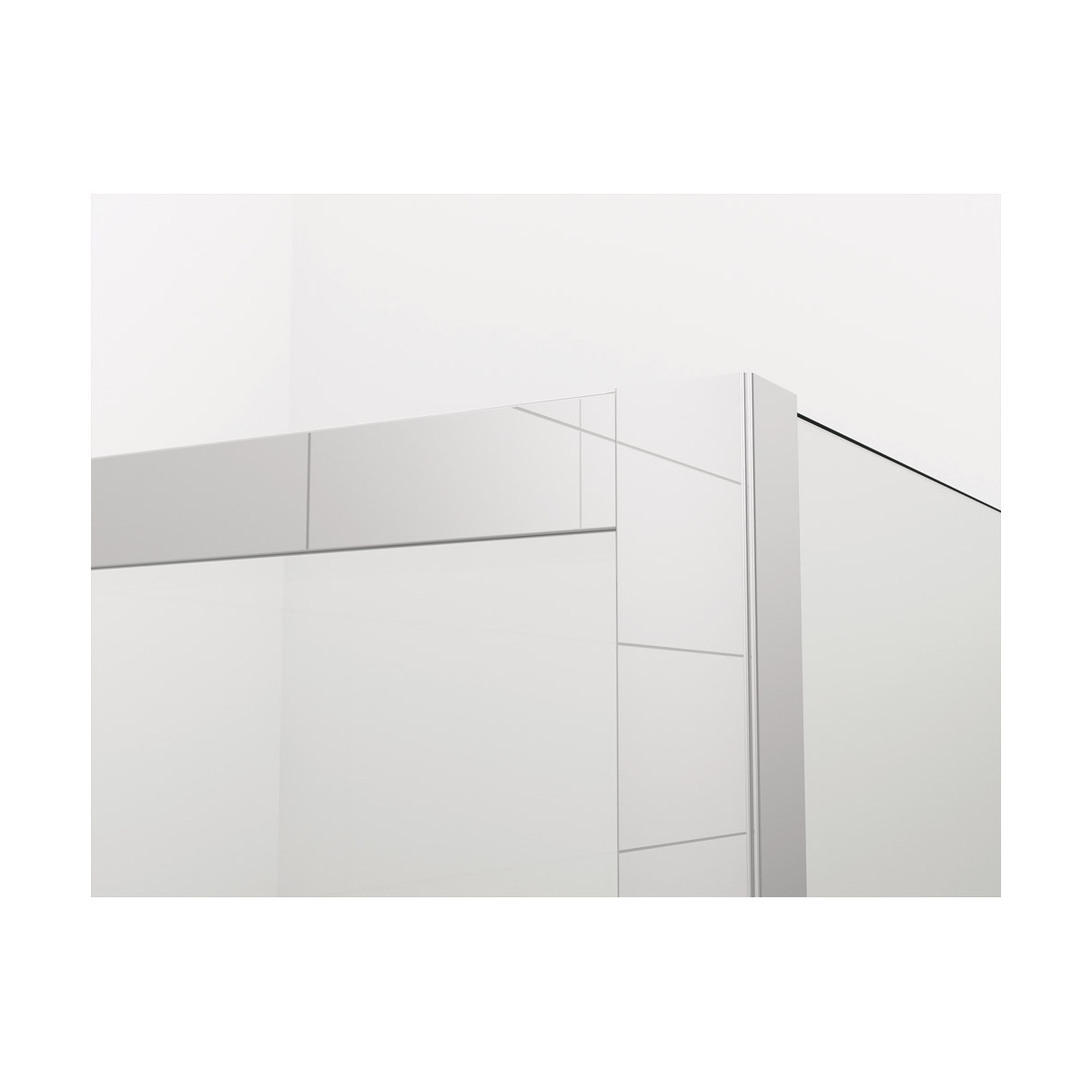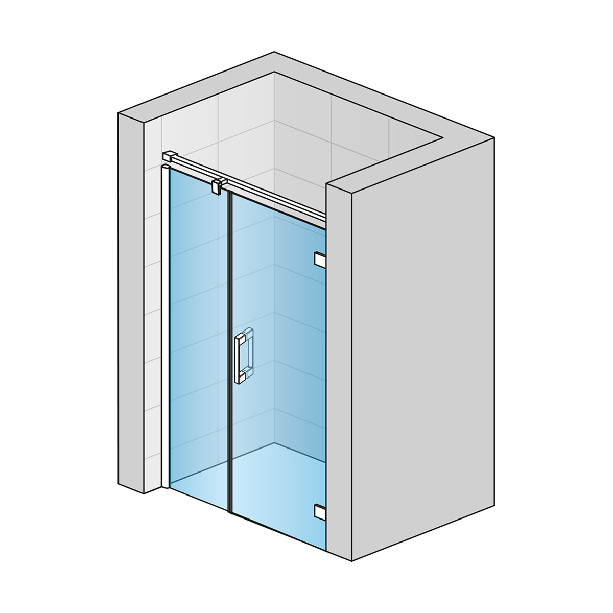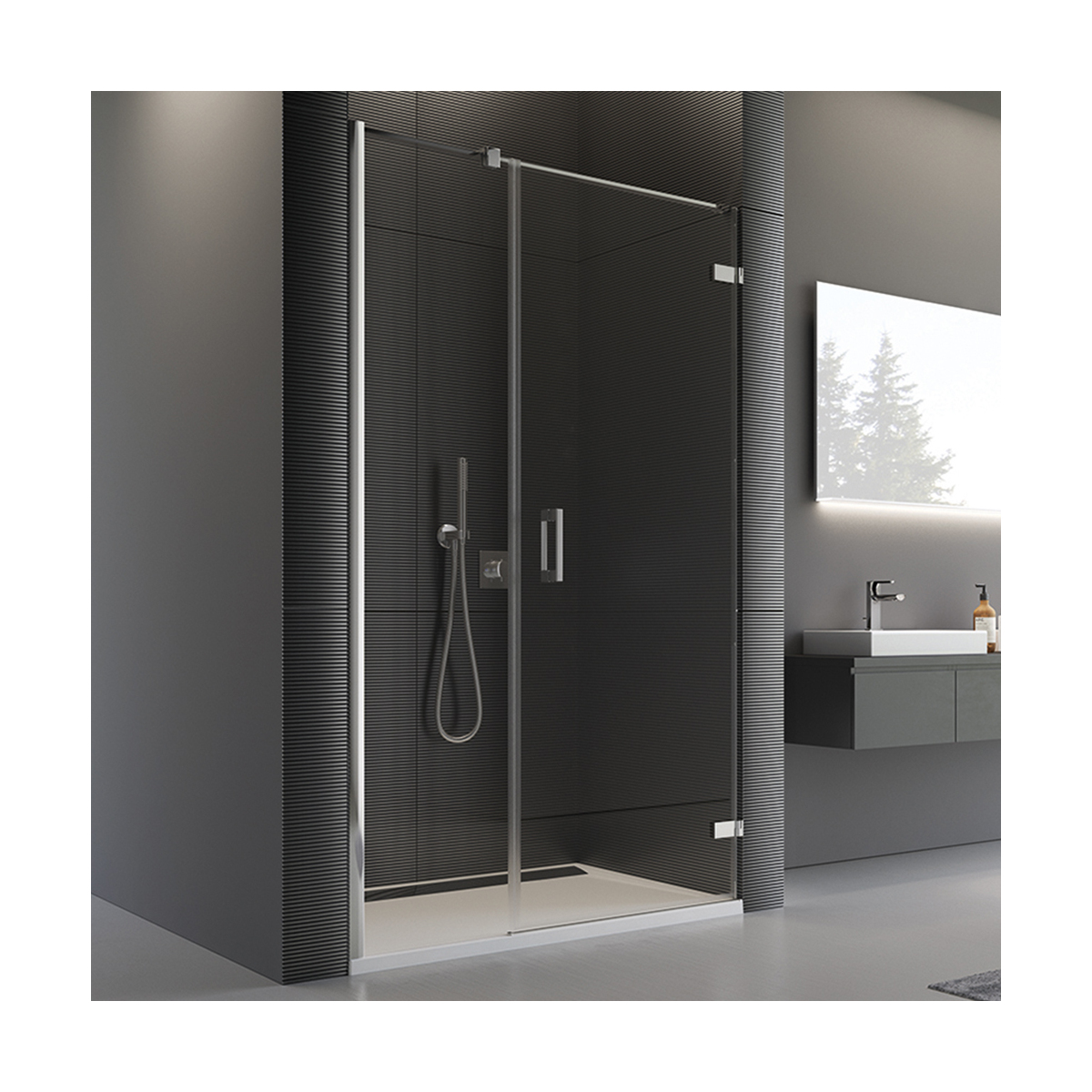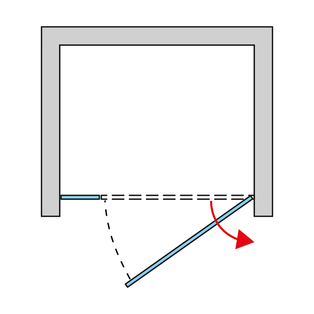 PU31P - 120 D chrom+transparent - jednokřídlé dveře s pantem u zdi a s pevnou stěnou v rovině s vyrovnávacím profilem - 8 mm bezpečnostní sklo, stabilizační vzpěra, chromovaný vyrovnávací profil, chromované panty integrované, otvírání ven, magnetické těsnění, aluchromová prahová lišta.
