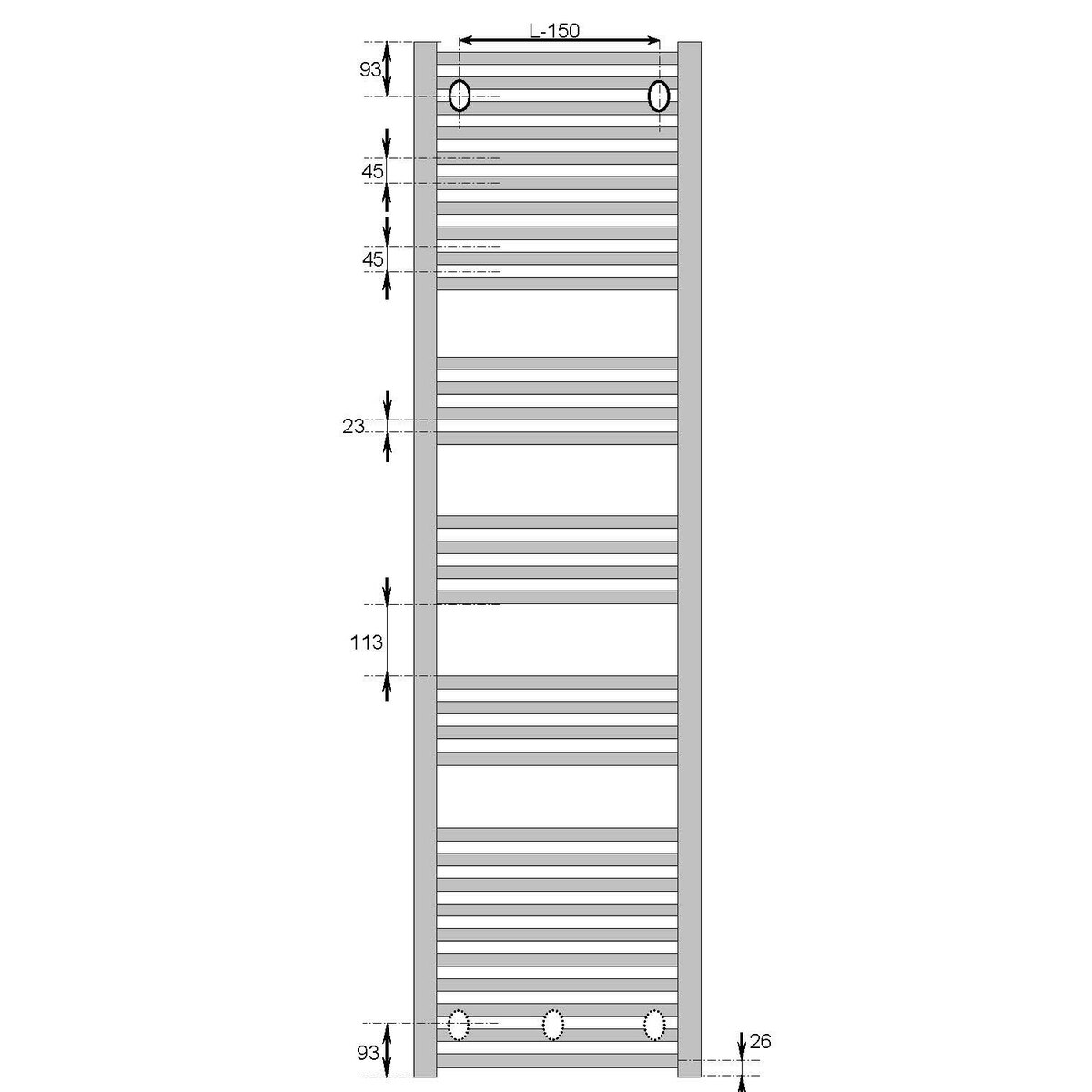 Vodorovné přímé provedení s přesně opracovanými ocelovými trubkami mezi svislými sběrnými trubkami s D-profilem. Práškové lakování ve standardní bílé barvě RAL 9016, povrchová úprava podle normy DIN 55 900. Součástí balení je sada pro upevnění na stěnu včetně odvzdušňovací a zaslepovací zátky. Spodní středové připojení s připojovací roztečí 50 mm. Topné těleso je určené pro připojení na teplovodní systém vytápění. Provozní tlak 8 bar, zkušební tlak 10 bar. Těleso měřeno podle DIN EN 442. Baleno v kartonové krabici s ochranou hran.