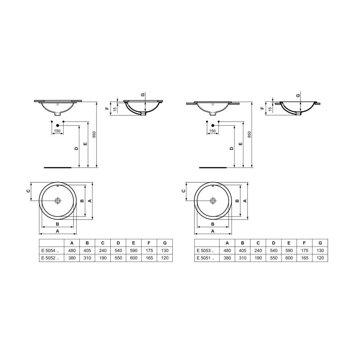 Umyvadlo zápustné Connect 48 cm, bez otvoru, bílé, do desky, s přepadem, Ideal Standard, E505401