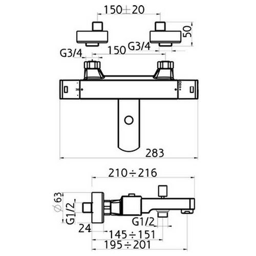 Vanová baterie Aquasave 150 mm, chrom, nástěnná, termostatická, bez příslušenství, Novaservis 2820/1,0