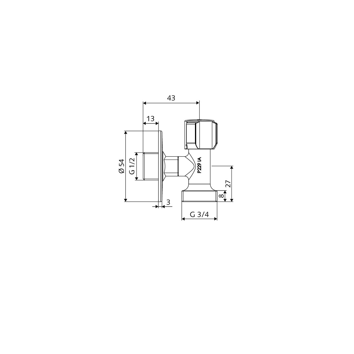 Rohový ventil pro připojení koncových zařízení k vodovodním rozvodům v malém prostoru. Ventil je osazen rukojetí COMFORT a posuvnou rozetou průměr 54 mm,