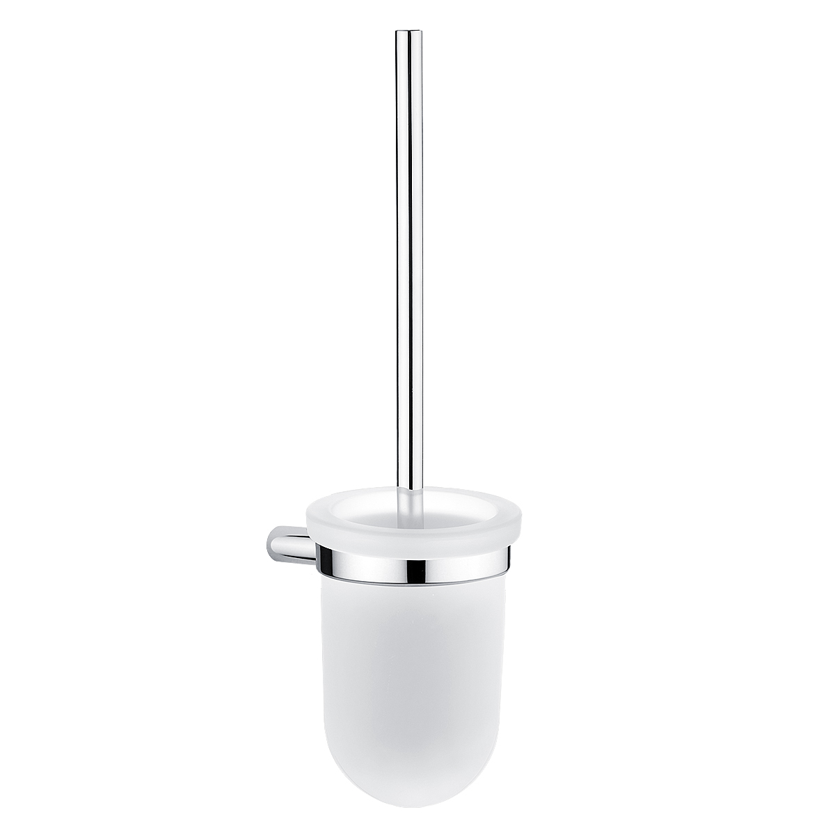 Toaletní WC kartáč s nádobkou z matovaného skla, nízká. Rukojeť kartáče z mosazi s povrchovou úpravou chrom.