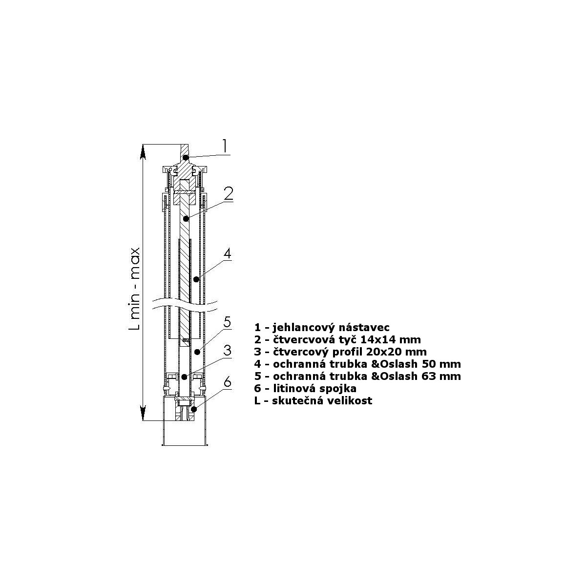 materiál: ocelová čtvercová tyč a čtvercový profil tř. 11.375, ochranná trubka HDPE, jehlancový nástavec a spojka z tvárné litiny GGG40/EN JS 1030 galvanicky pozinkované