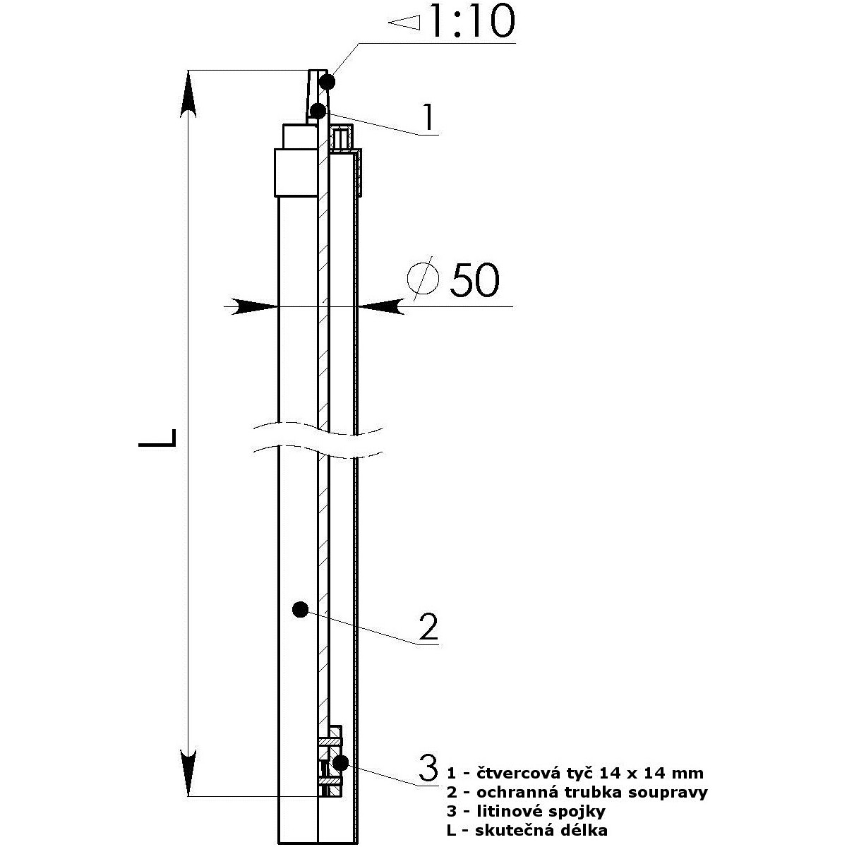 materiál: ocelová čtvercová tyč tř. 11.375, ochranná trubka HDPE Ø 50 mm, spojka z tvárné litiny GGG40/EN JS 1030 galvanicky pozinkované.